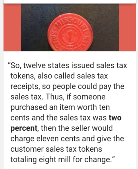 While taxes have been in existence for several millennia sales tax tokens are a much more recent and short-lived invention. Image of the state of Missouri. Texas 1960-mid 60s these were all pro or anti-tax tokens no state issues Utah 1937-1950 Washington 1935-1951.